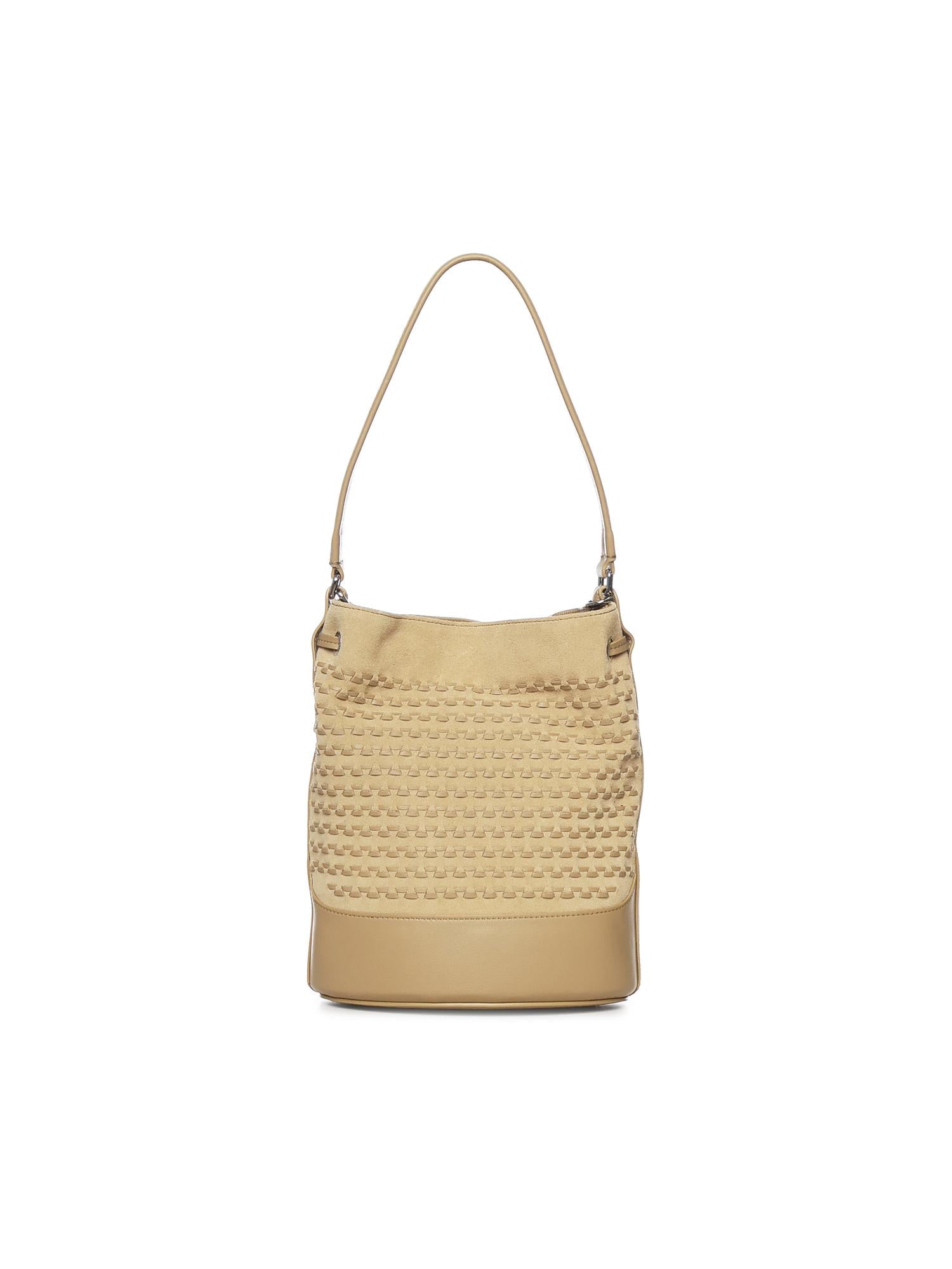 - Leather drawstring closure with twist-lock buckle